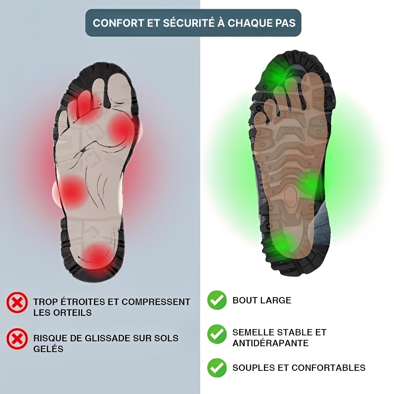 Les Bottes d'Hiver combinent adhérence antidérapante et soutien orthopédique. La semelle est conçue pour apporter une sensation de stabilité, tandis que la coupe large et l'amorti sont pensés pour accompagner les articulations.