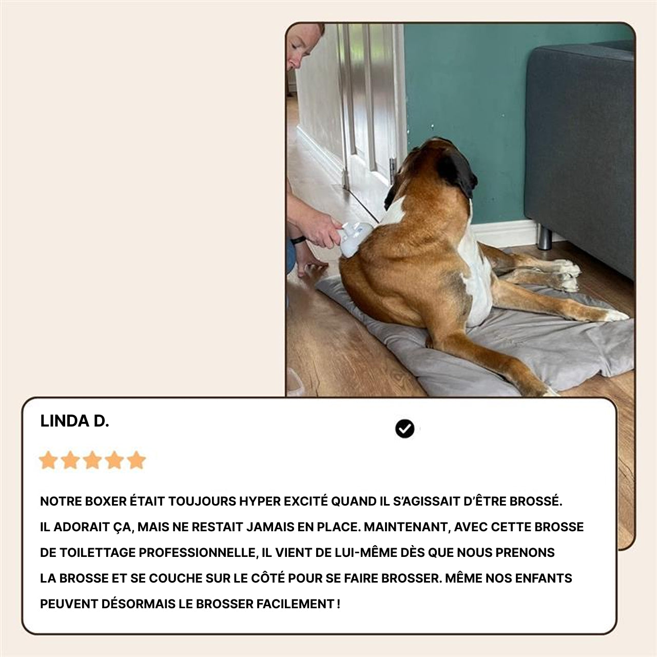 « Je n'ai jamais eu une brosse qui fonctionne aussi bien pour Amax, elle correspond à mes attentes. Mon chien sent bon et son poil est visiblement plus brillant. Enfin, les poils ne volent plus dans toute la maison. »