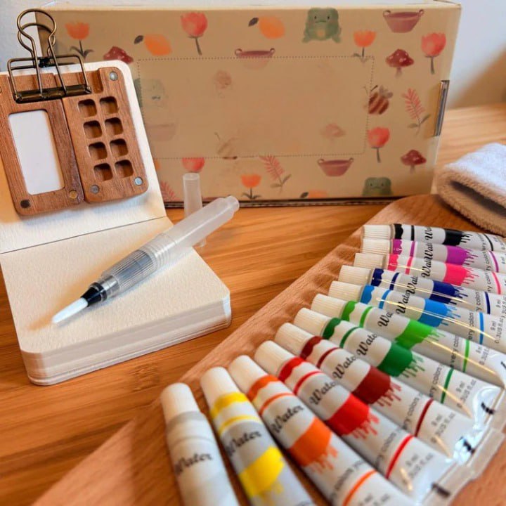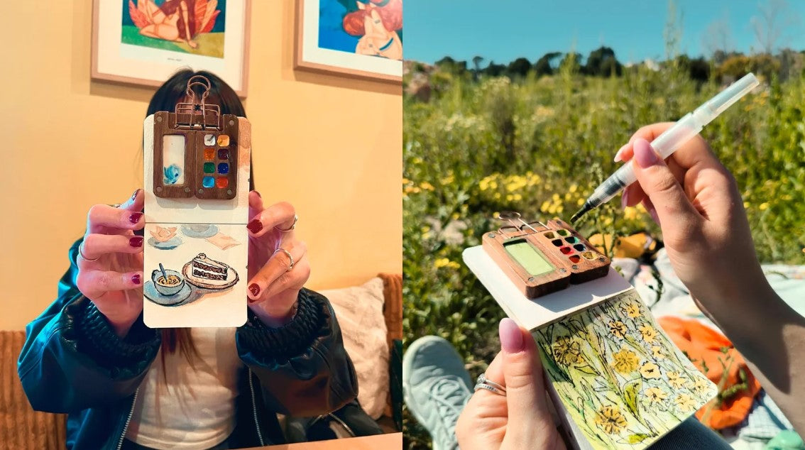 C'est dans cet esprit qu'a été imaginé le Kit D'Aquarelle De Voyage, conçu pour tenir dans la main. Discret, élégant et résistant à l'eau, il permet de peindre tranquillement dans un café, sans verre d'eau, sans énorme carnet et sans être observé. Juste un moment à soi, ses pensées et le plaisir apaisant des couleurs sur le papier.