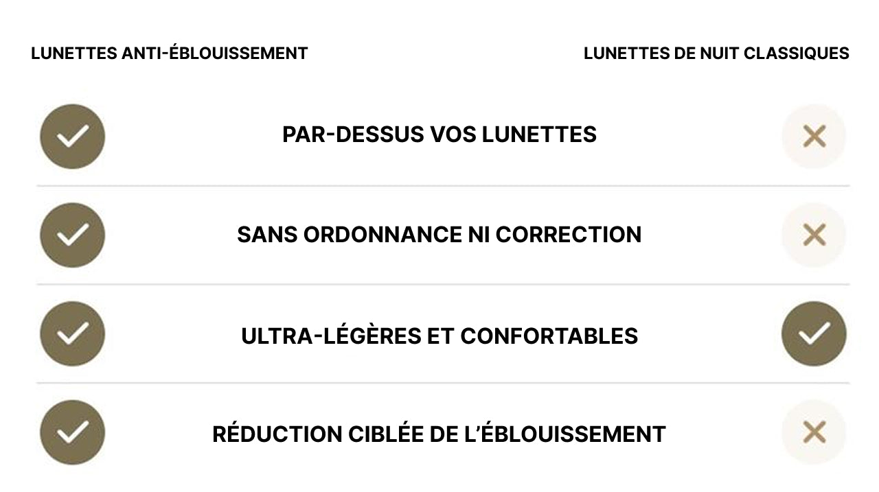 « Impressionnée dès la première conduite de nuit. Je pensais que ces lunettes ne pourraient jamais passer par-dessus mes montures épaisses. Elles s'adaptent parfaitement, restent en place et atténuent efficacement la gêne provoquée par les phares. Je perçois la route plus clairement dès les premiers kilomètres. »