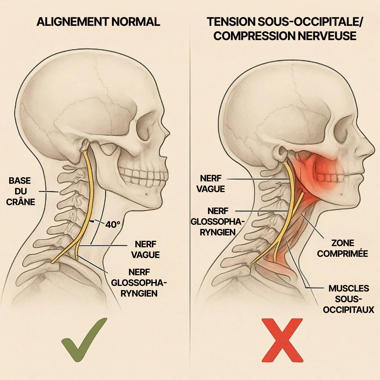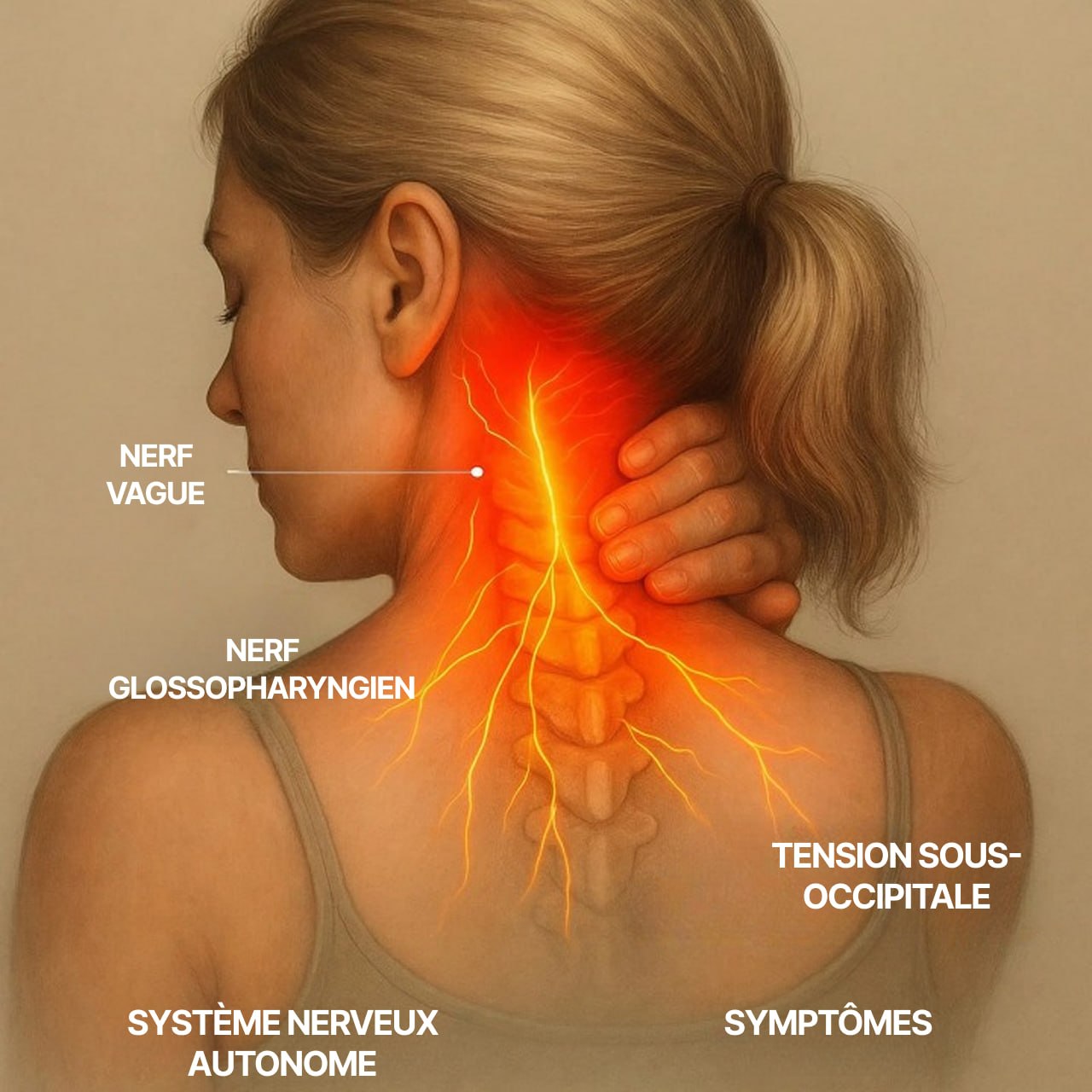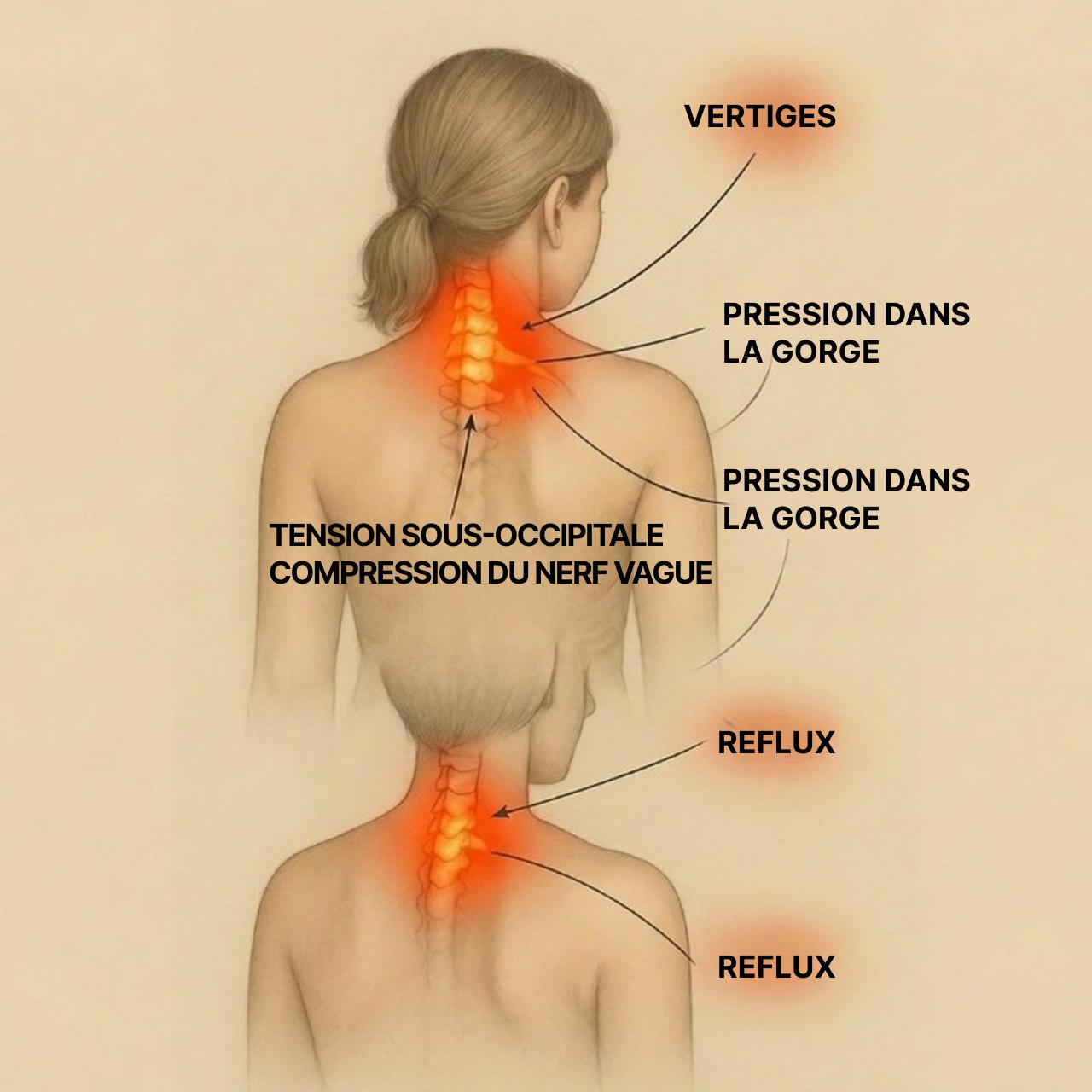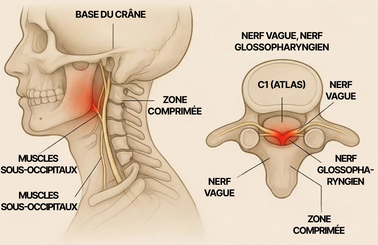 Lorsque cette zone est soumise à des tensions, cela peut influencer certains nerfs cervicaux. Le corps ne ressent pas uniquement des tensions au cou : cela peut aussi s'accompagner d'étourdissements, de reflux, de variations du rythme cardiaque, de maux de tête ou d'une sensation de brouillard mental.
