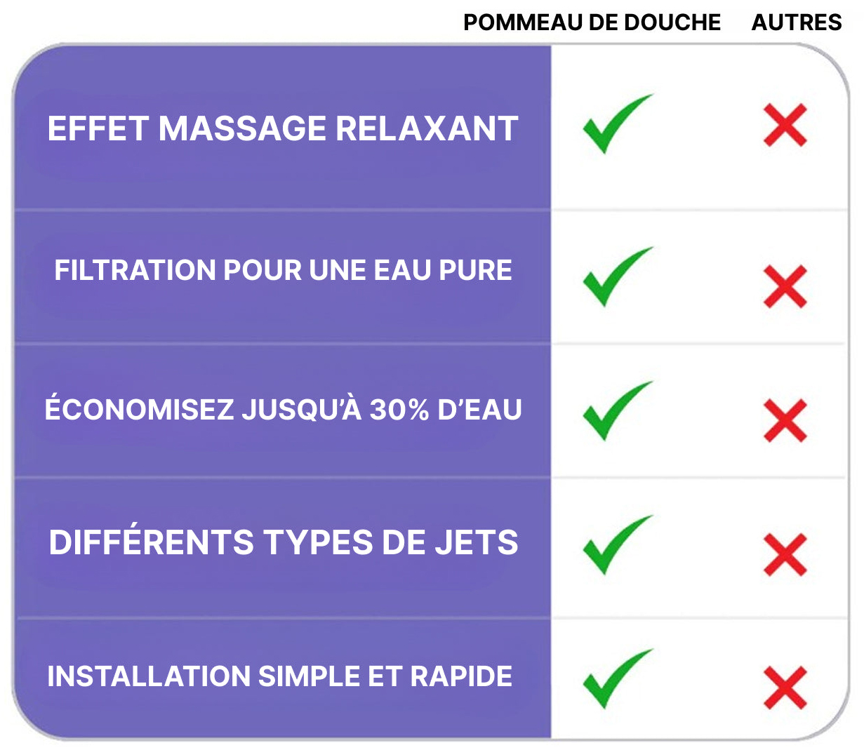 « Une expérience vraiment surprenante ! Ma peau me semble bien mieux depuis que je l'utilise. Ce Pommeau De Douche rend ma routine de douche beaucoup plus agréable et en fait un vrai moment de bien-être. »