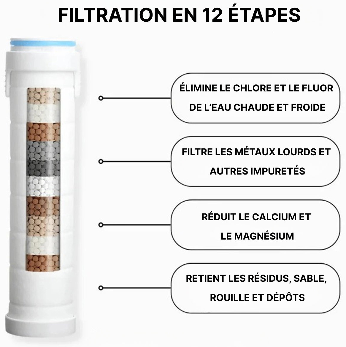 Le filtre aide à réduire les impuretés présentes dans l'eau, souvent sources d'agressions pour la peau.