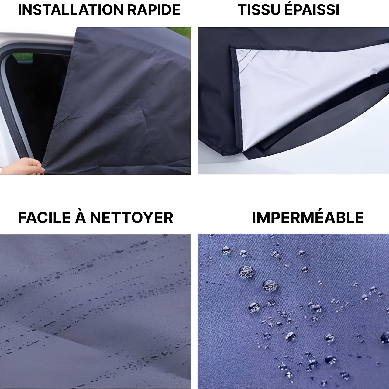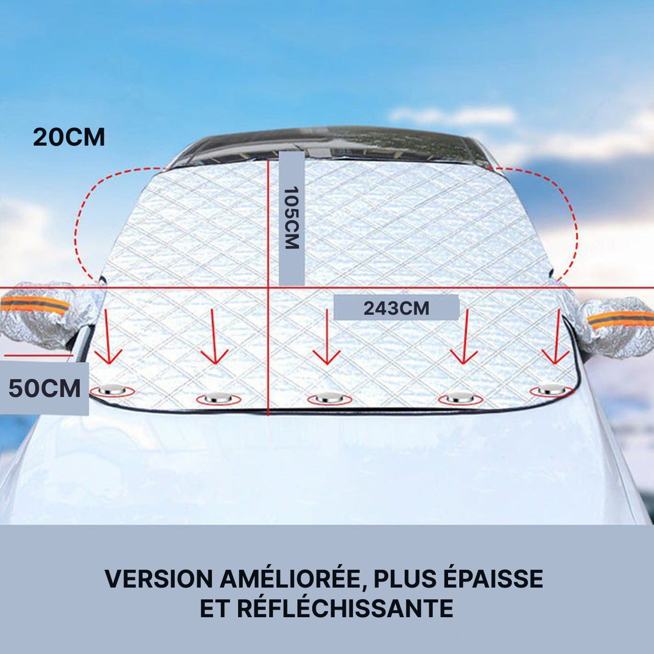 Fabriqué en film aluminium et en coton. Sa conception renforcée vise à mieux s'adapter au pare-brise et à offrir une protection par temps venteux, pluvieux ou enneigé.