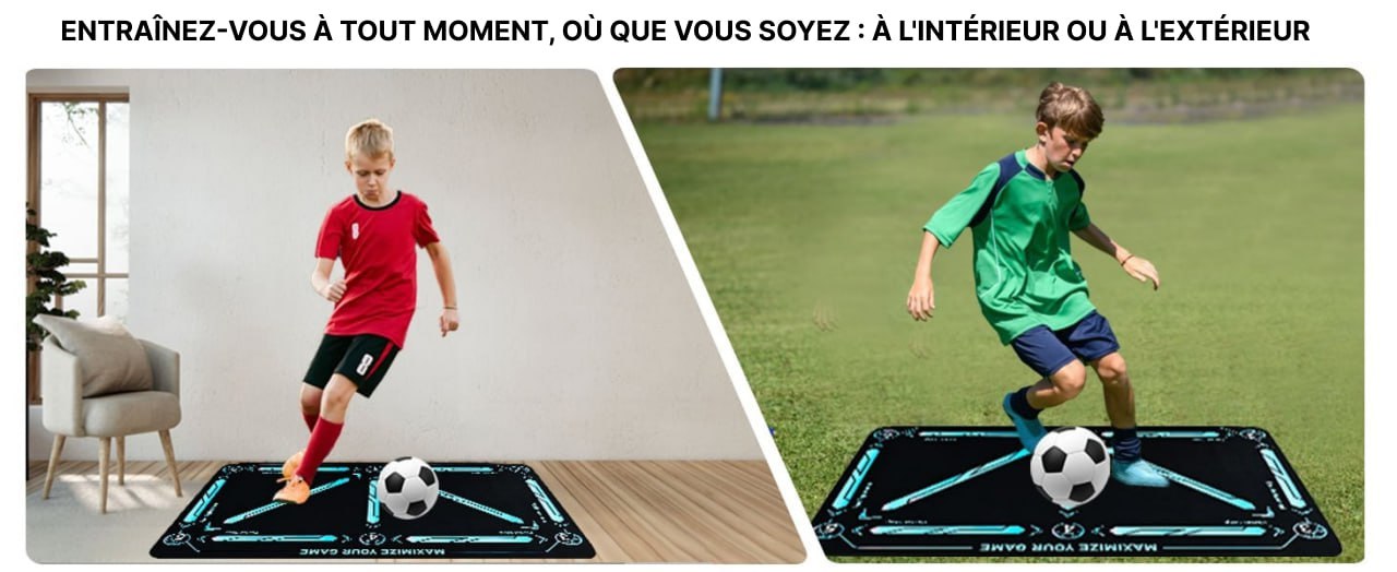 Pensé pour un usage en intérieur, comme dans un salon, ce tapis offre suffisamment d'espace pour travailler le ballon en reculant. Cet exercice est souvent utilisé pour solliciter l'équilibre, la coordination et la force, des qualités importantes dans la pratique du football.
